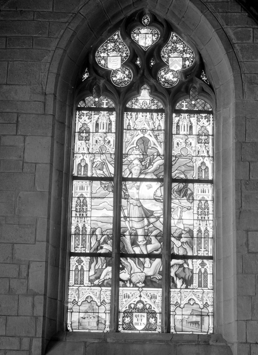 Verrière de la baie 16 : Saint Michel et le dragon, basilique Notre-Dame-du-Roncier (Josselin),