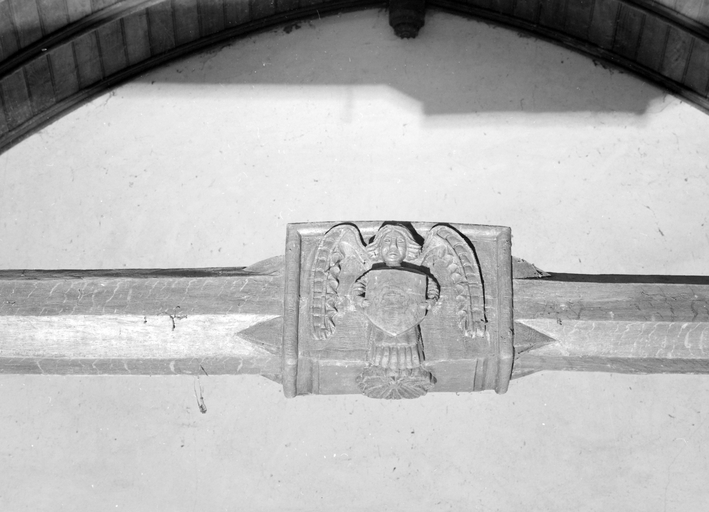 Château, chapelle : entrait sculpté décoré d'un ange portant un blason (état en 1984)Immatriculation