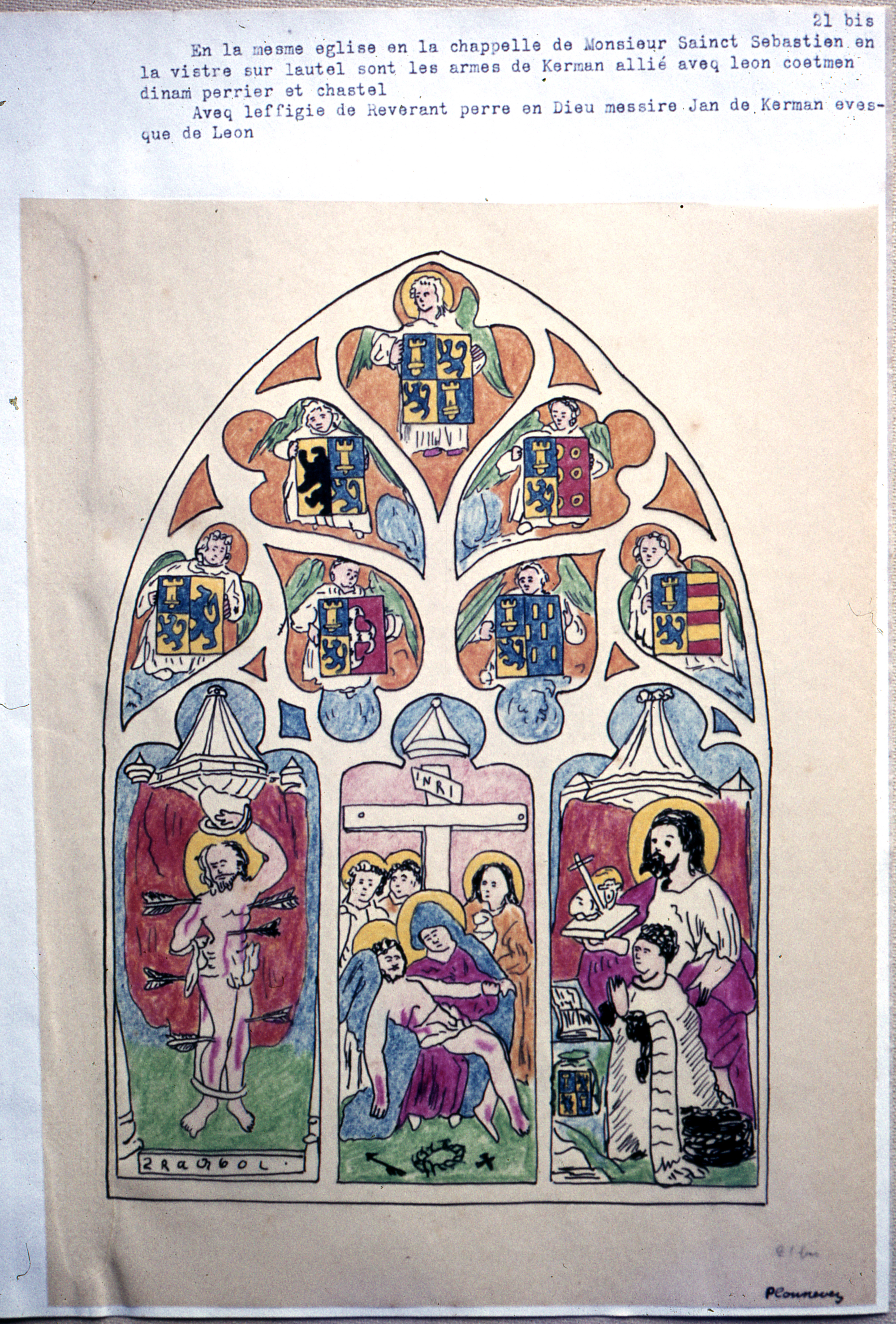 Verrière : Descente de croix encadrée par le Martyre de saint Sébastien et Jean de Carman, chanoine de Léon présenté par Saint Jean-Baptiste ; dans le tympan, les diverses alliances de la famille de Carman (dessin, 1614)Immatriculation