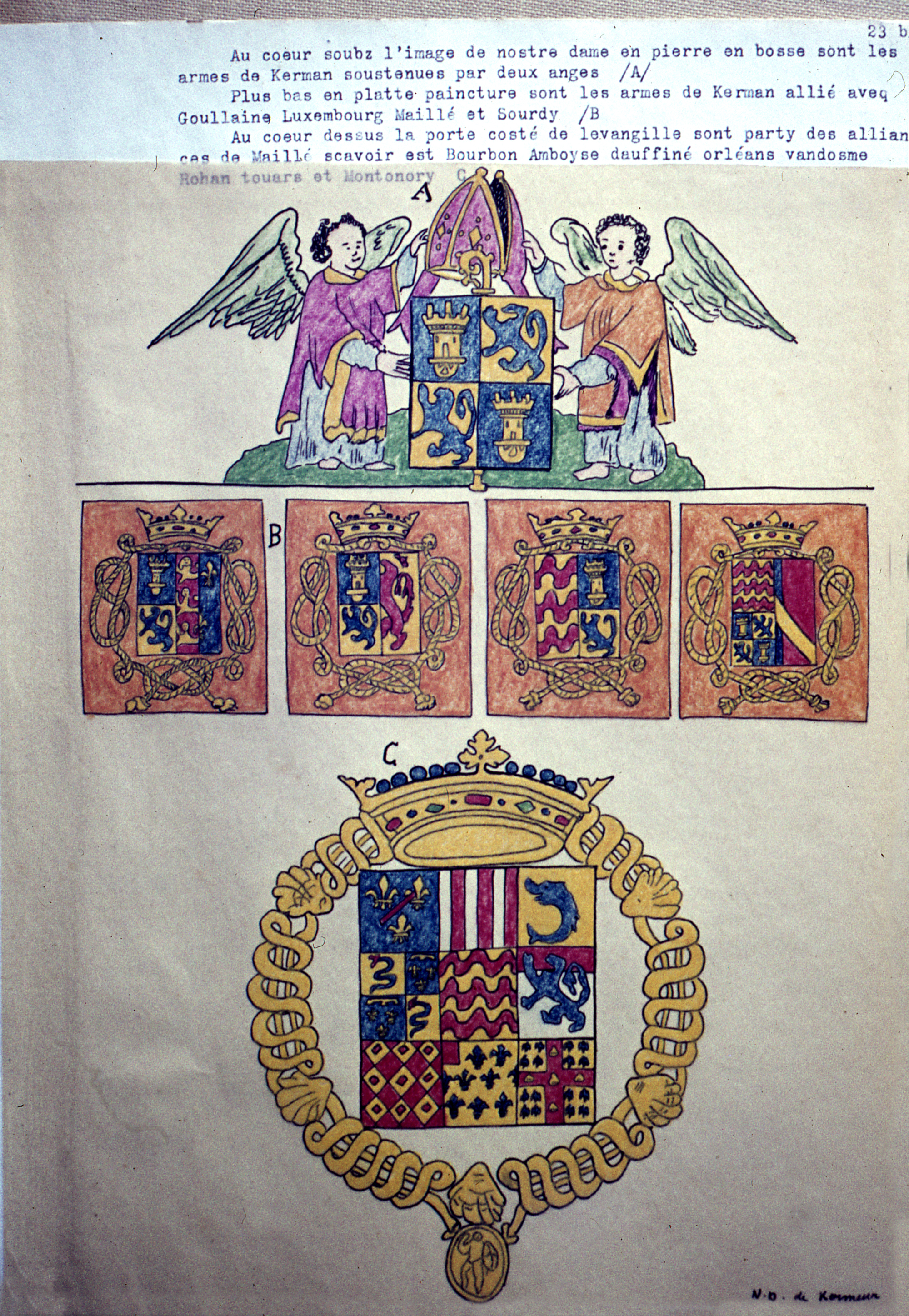 BOURICQUEN, Jan. Bref estat es preminences du marquis de Kerman et conte de Seszploe de mesme quelles sont es eglisses covent et chapelles tant en pierre boys viltres que lisières en Leon. Visite recuilli es ce presant livre faict pour hault et puissant mesire Charles de Maillé chevalier de l'Ordre du roy, gentilhomme ordinaire de sa chambre, seigneur marcquis de Kerman conte de Seizploue, baron de la Forest, [etc], par son peintre et vistrier humble et fidel serviteur Jan Bouricquen en 1614.