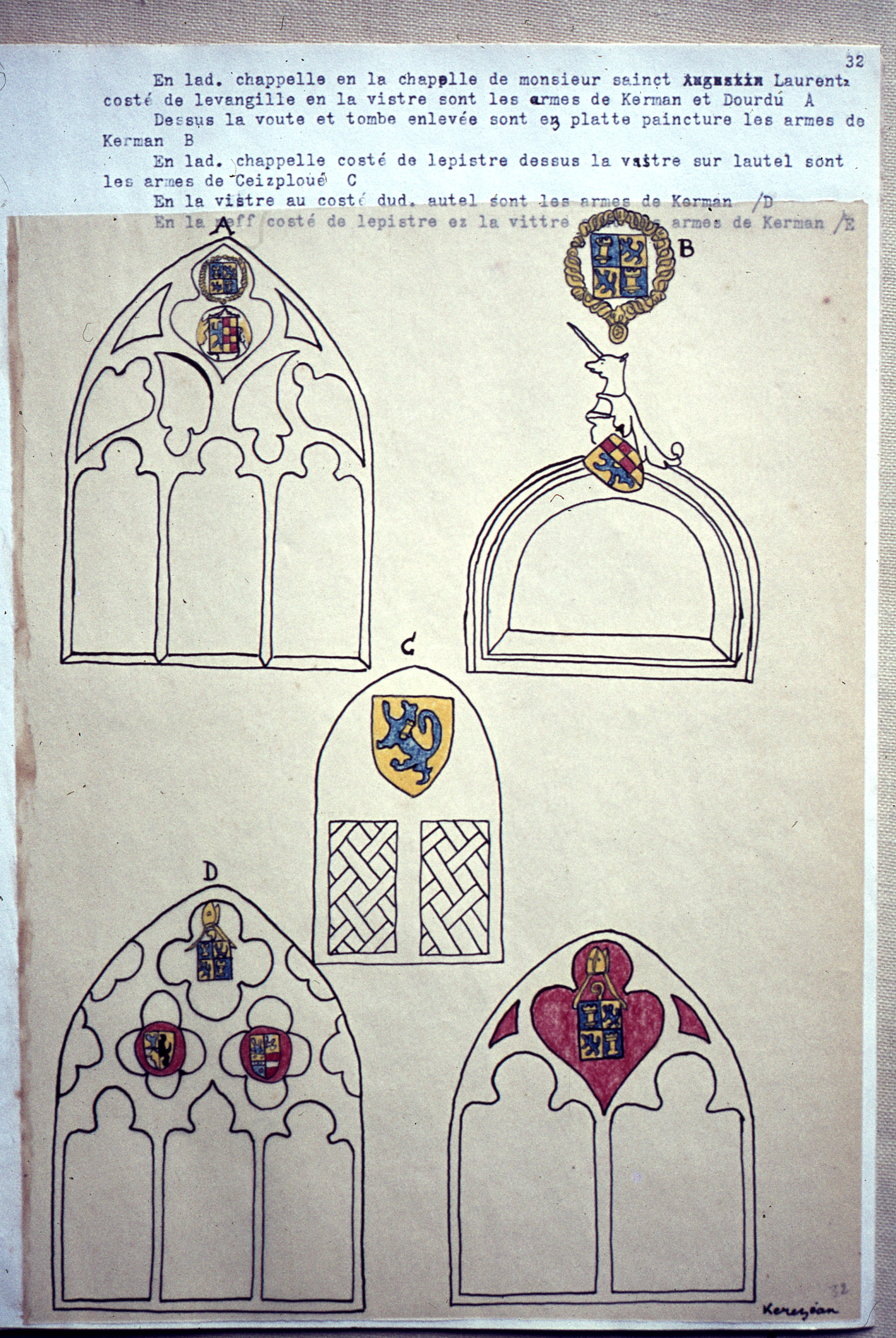BOURICQUEN, Jan. Bref estat es preminences du marquis de Kerman et conte de Seszploe de mesme quelles sont es eglisses covent et chapelles tant en pierre boys viltres que lisières en Leon. Visite recuilli es ce presant livre faict pour hault et puissant mesire Charles de Maillé chevalier de l'Ordre du roy, gentilhomme ordinaire de sa chambre, seigneur marcquis de Kerman conte de Seizploue, baron de la Forest, [etc], par son peintre et vistrier humble et fidel serviteur Jan Bouricquen en 1614.