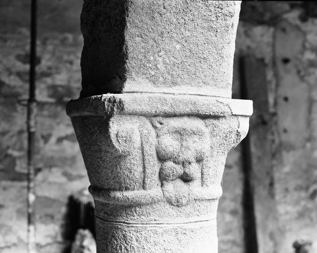 Vue de la cour et de la galerie d'arcades en arc plein cintre : angle sud-est, détail du chapiteau de l'une des colonnes (état en 1985)Immatriculation