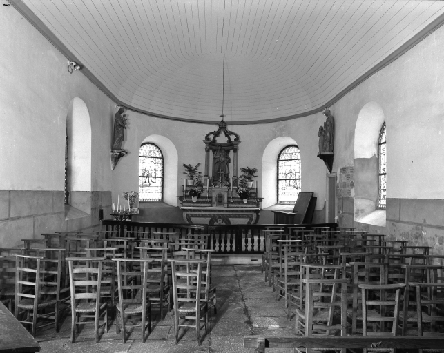 Plougoulm, chapelle de Notre-Dame de Prat-Coulm : intérieur, vue axiale est, état en 1985Immatriculation