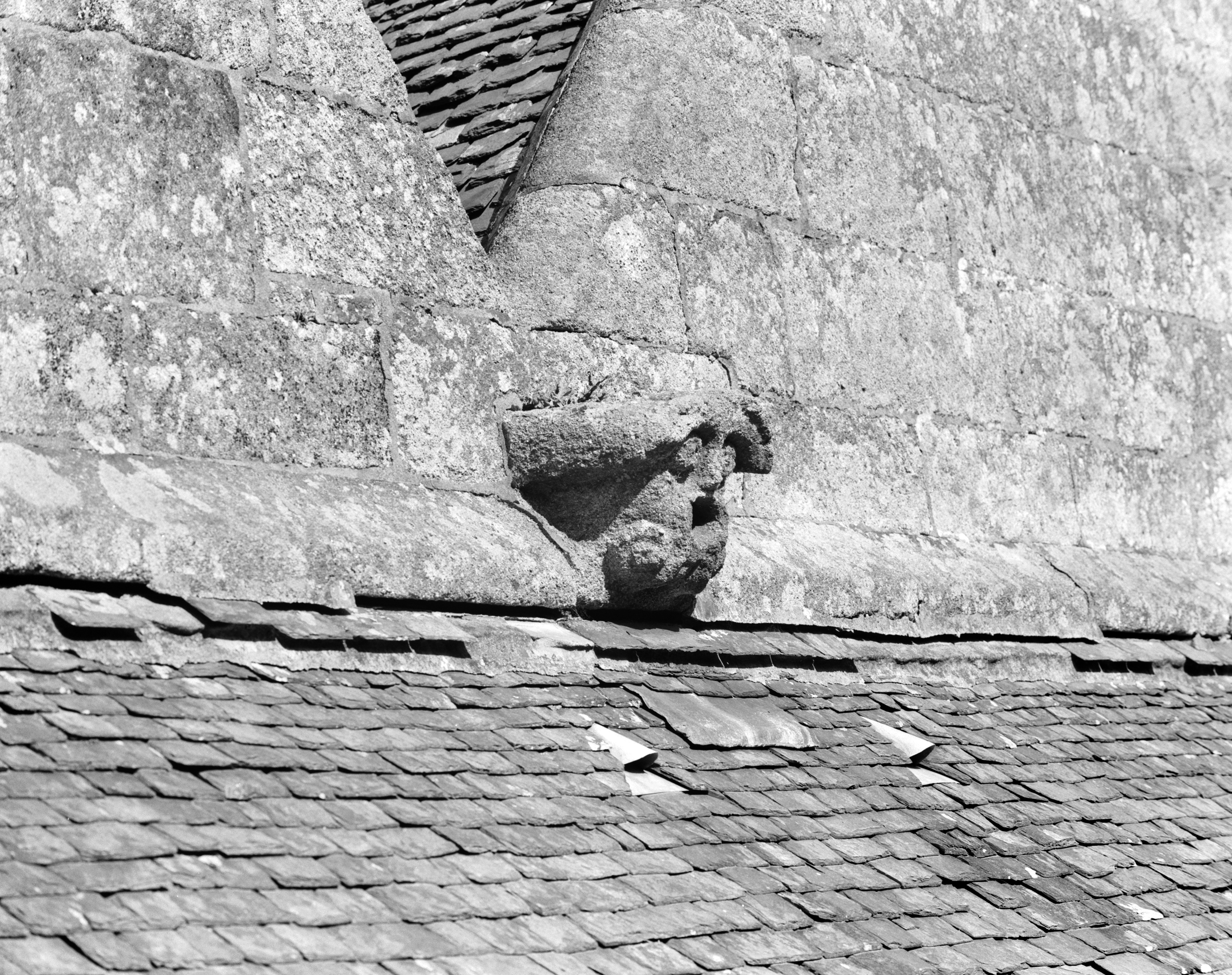 Façade ouest, niveau des toits, tête sculptéeImmatriculation