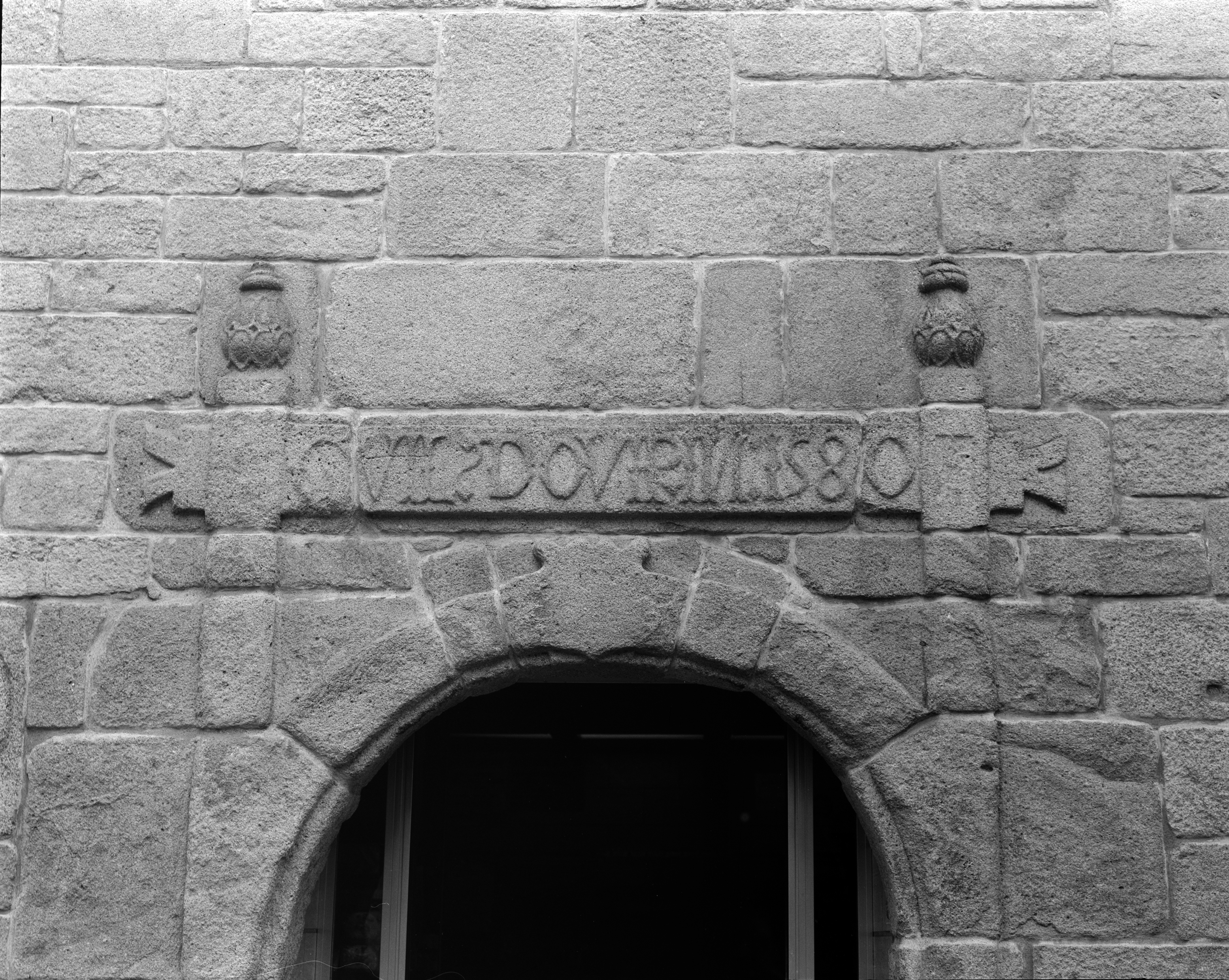 Porte sud et inscription : GUILS DOUARIN 1580, vue rapprochée. (1985)Immatriculation