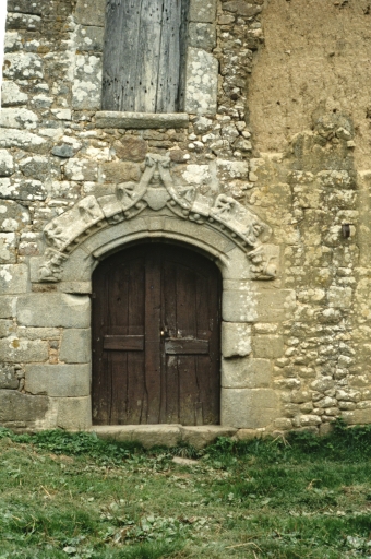 Elévation antérieure, porte sculptée.Immatriculation