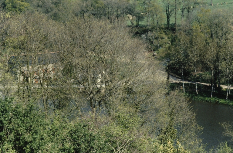 Vue vers l'étang et le moulin.Immatriculation