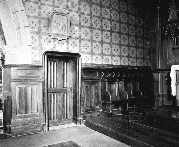 Intérieur, choeur : vue de détail des stalles et des lambris.Immatriculation