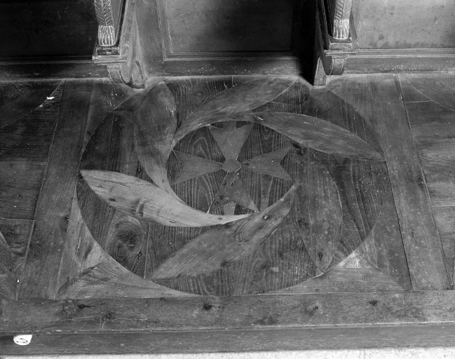 Stalles, vue de détails des motifs de l'estrade.Immatriculation