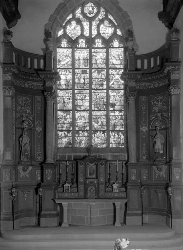Table d'autel, devant d'autel, retable, exposition, gradins d'autel (3), statues (2) (maître-autel, retable architecturé à niche, retable cadre, tabernacle à ailes, figure d'ornement),