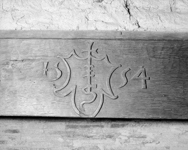 Etage, chambre ouest, cheminée, linteau avec marque de marchand, vue de détail.Immatriculation