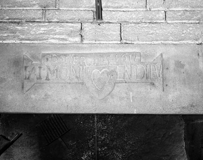 Logis, pièce est, cheminée, inscription, vue de détail.Immatriculation