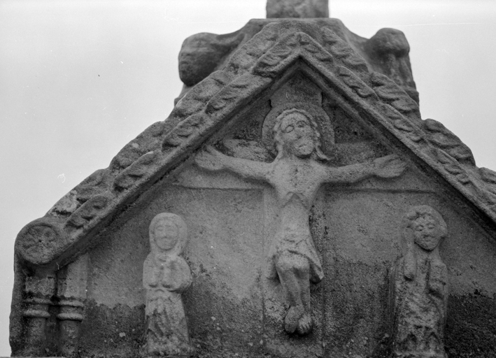 Croix de cimetière : socle de la face portant le Calvaire (état en 1985)Immatriculation