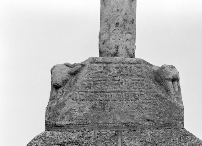 Croix de cimetière, socle de la face portant le Christ en croix : inscription (état en 1985)Immatriculation