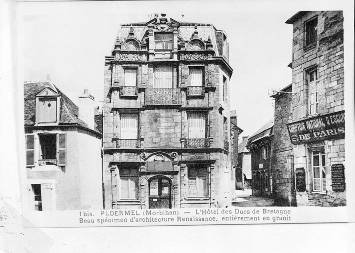 PLOERMEL (Morbihan) - L'Hôtel des Ducs de Bretagne (sic). Beau spécimen d'architecture Renaissance, entièrement en granit. Carte postale, [s. l. ; s. n. ; 2e quart 20e siècle].