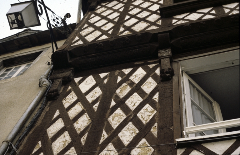 Maison, élévation sur rue, premier étage : mise en oeuvre du pan de bois (état en 1985)Immatriculation