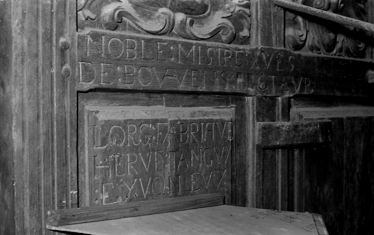 Sur la face avant du buffet, inscription Noble Messire Yves de Boavin, recteur lors fabrique Hervé Tanguy et Yvon Euzen, en l'an 1673.Immatriculation