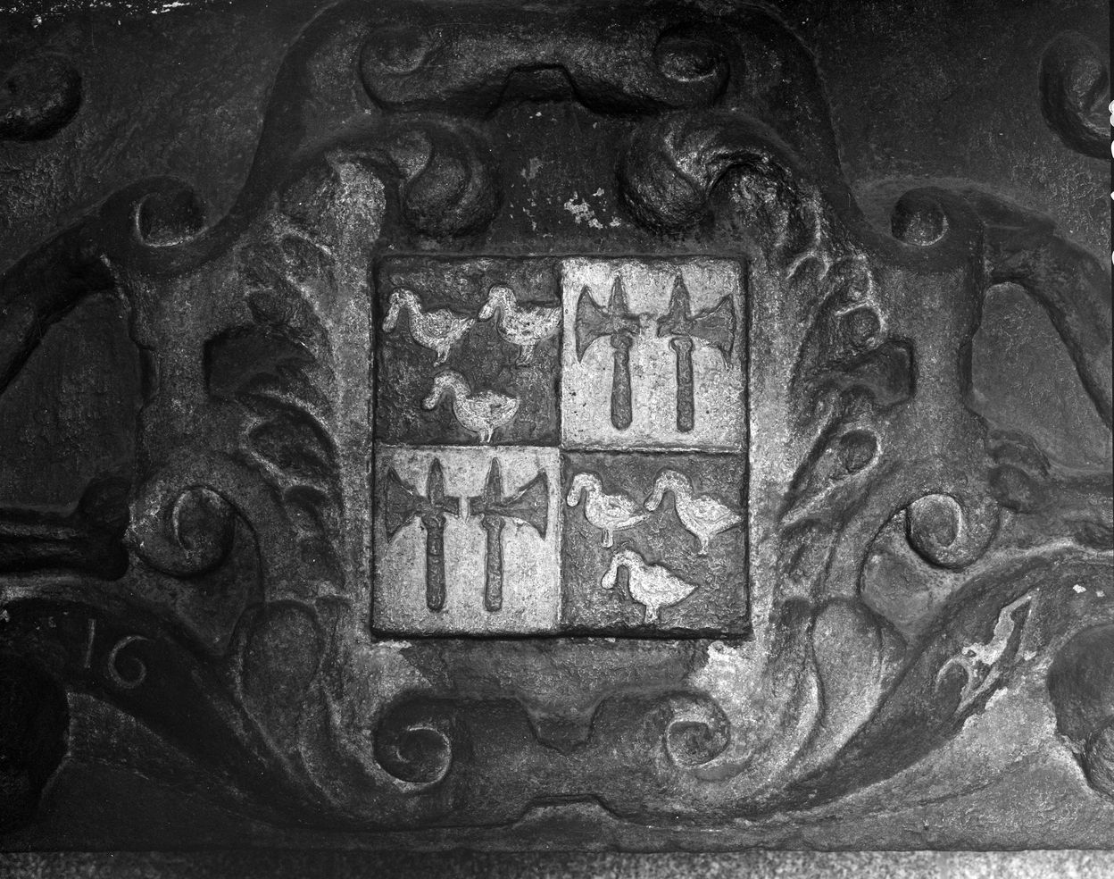 Château de la Villeneuve. Intérieur, cheminée au sous-sol, détail linteau, blason et date 1627Immatriculation