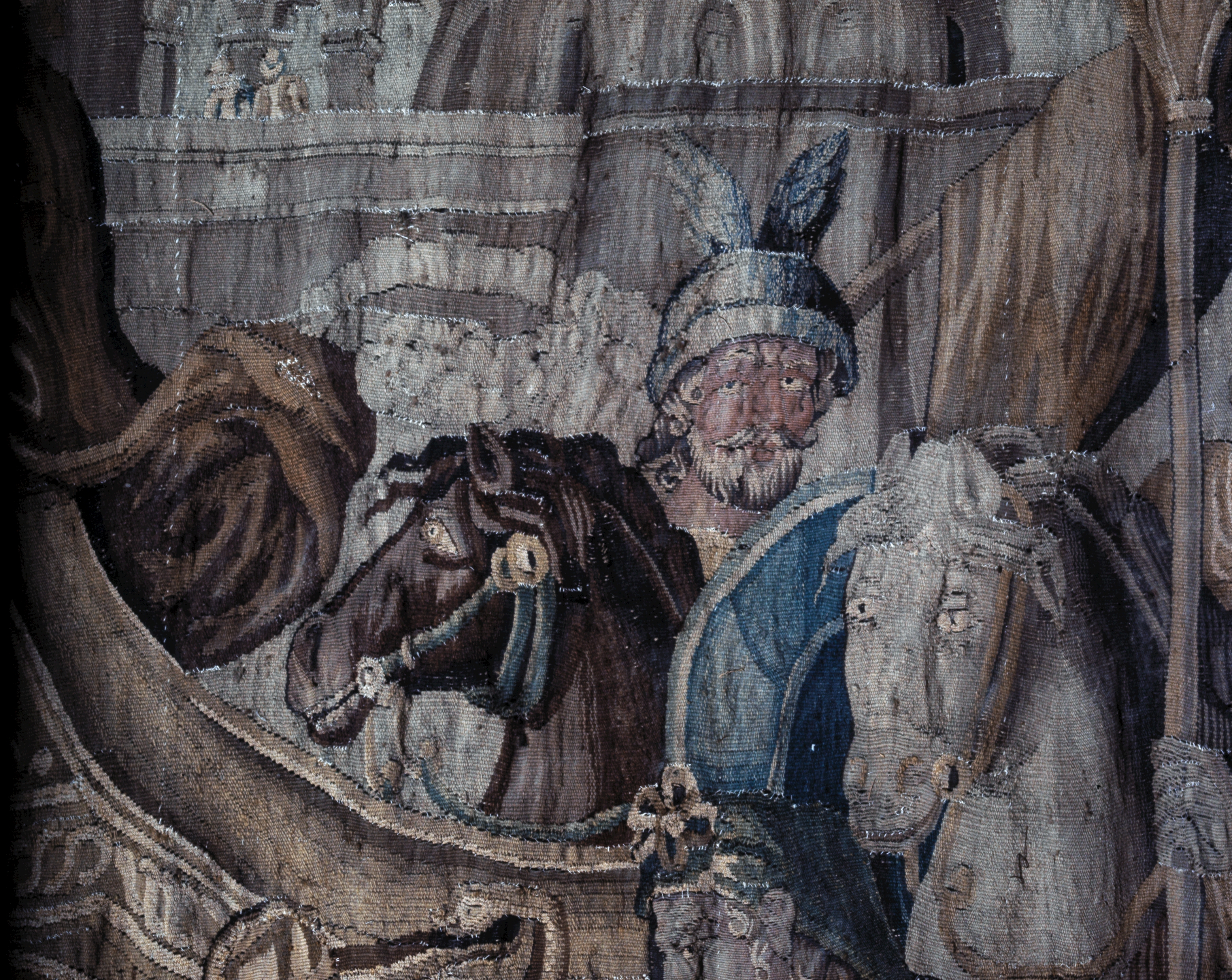 2ème étage, salle de gardes, mur ouest, tapisserie n° 3, détail homme barbu avec bouclierImmatriculation