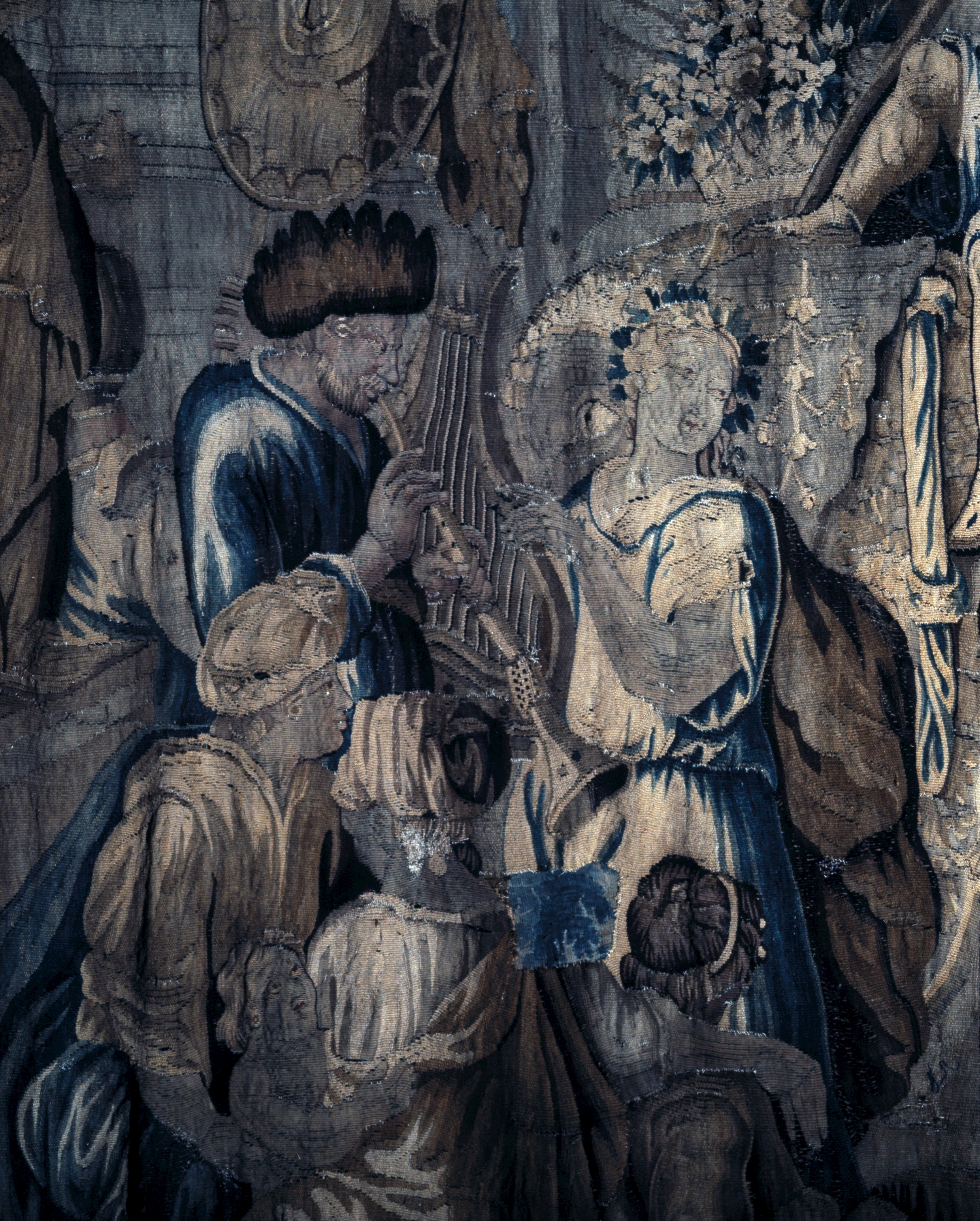 2ème étage, salle de gardes, mur ouest, tapisserie n° 3, détail homme jouant de la flute et femme harpisteImmatriculation