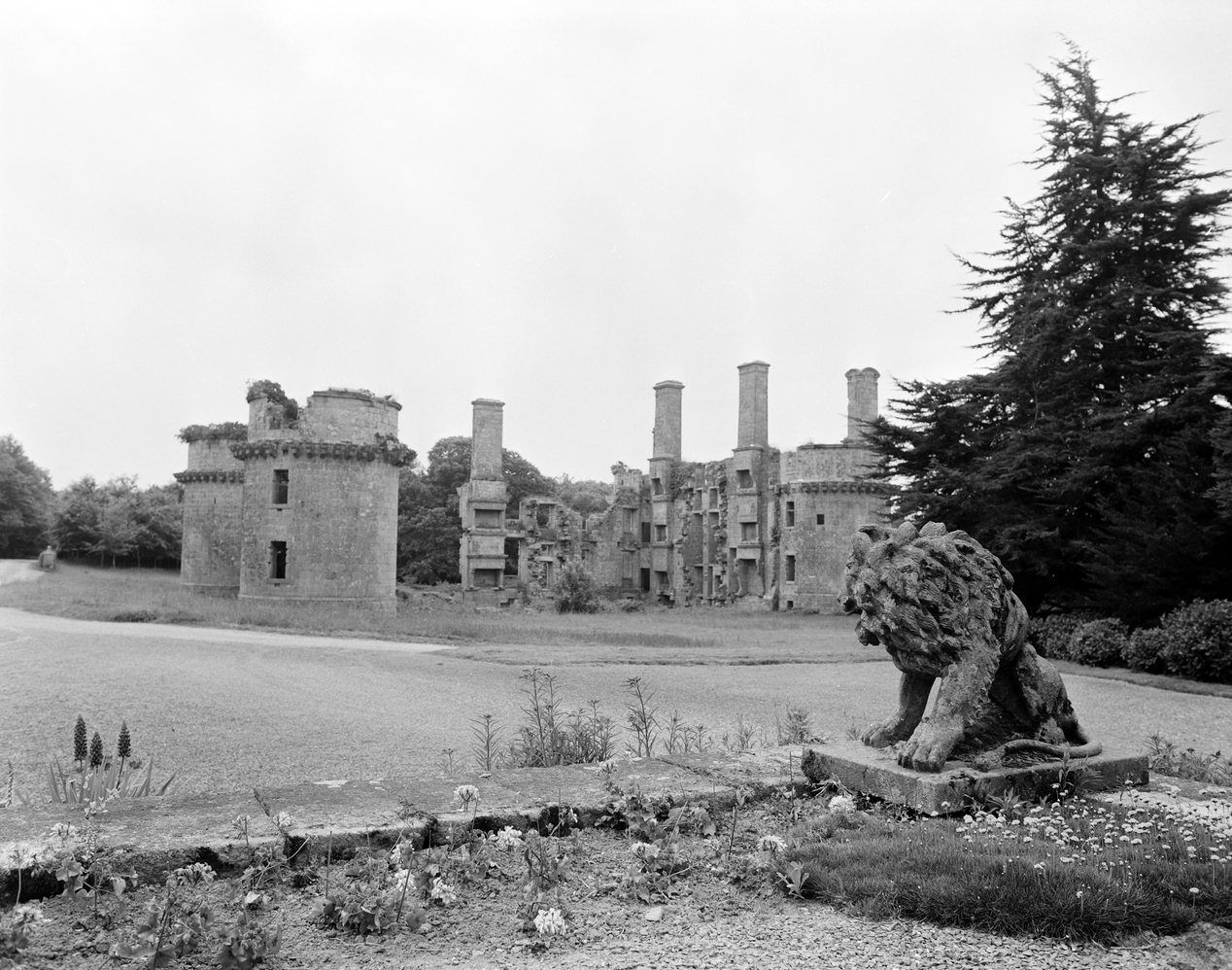 Vue générale depuis le nord et la terrasse du logis (état en 1986). Au premier plan, l'un des lions qui ornent le jardinImmatriculation