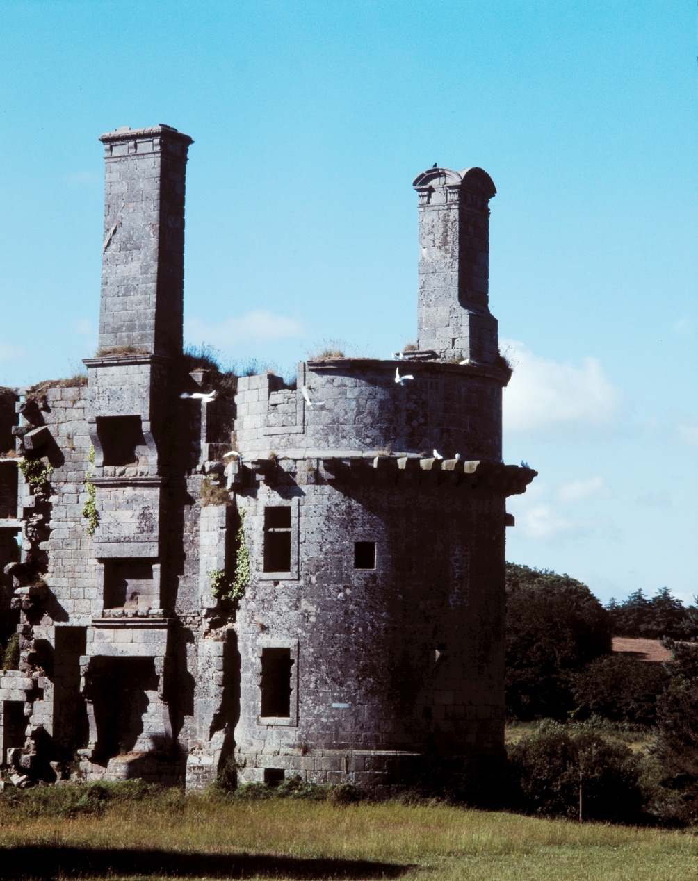 Vue de la tour ouest depuis le nord-est (état en 1986). A gauche, superposition de trois cheminées (rez-de-chaussée, premier étage et étage de comble). Les souches de cheminée sont ornéesImmatriculation