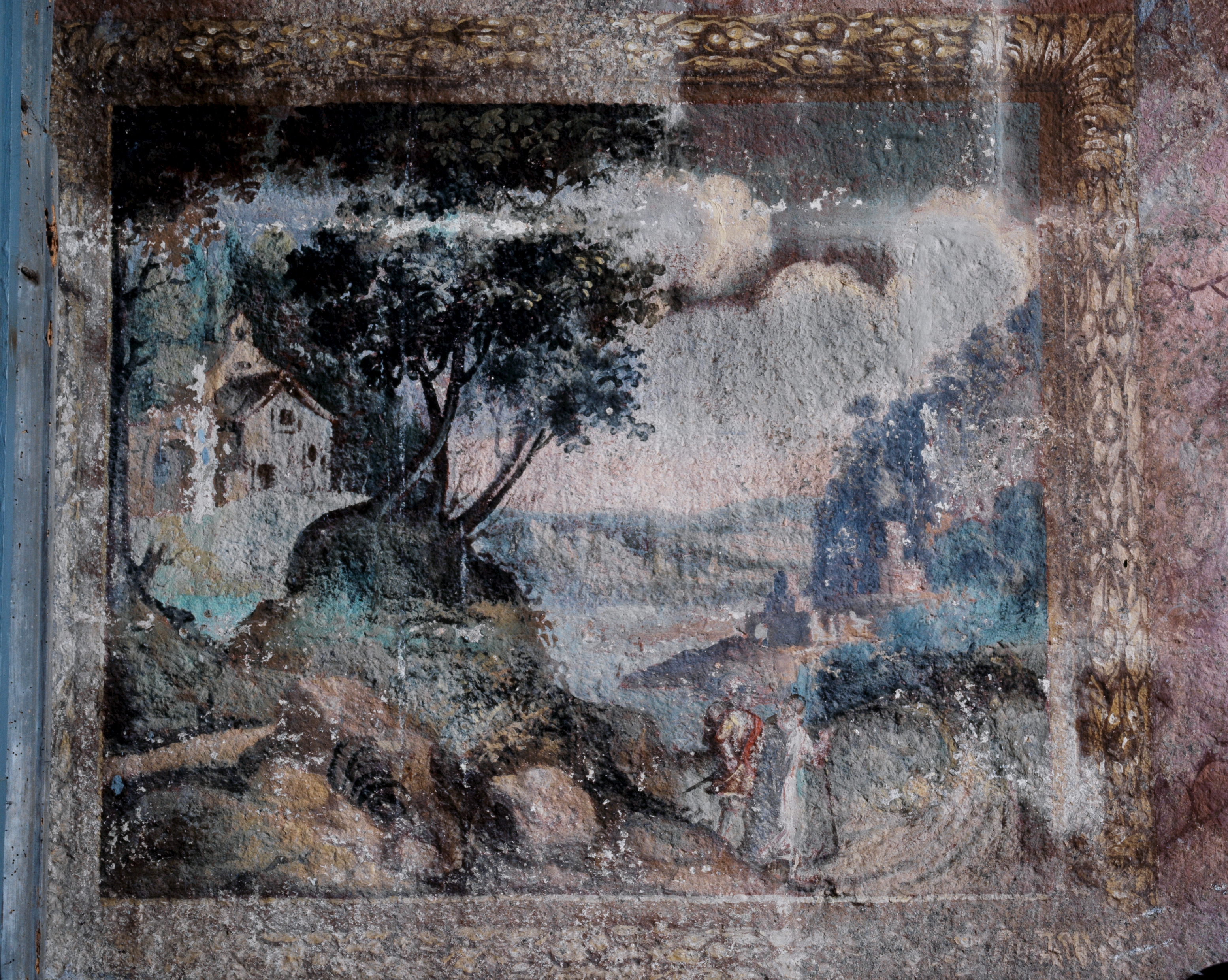Peinture monumentale 2 (angle sud-est) : Paysage avec deux personnages (état en 1986)Immatriculation
