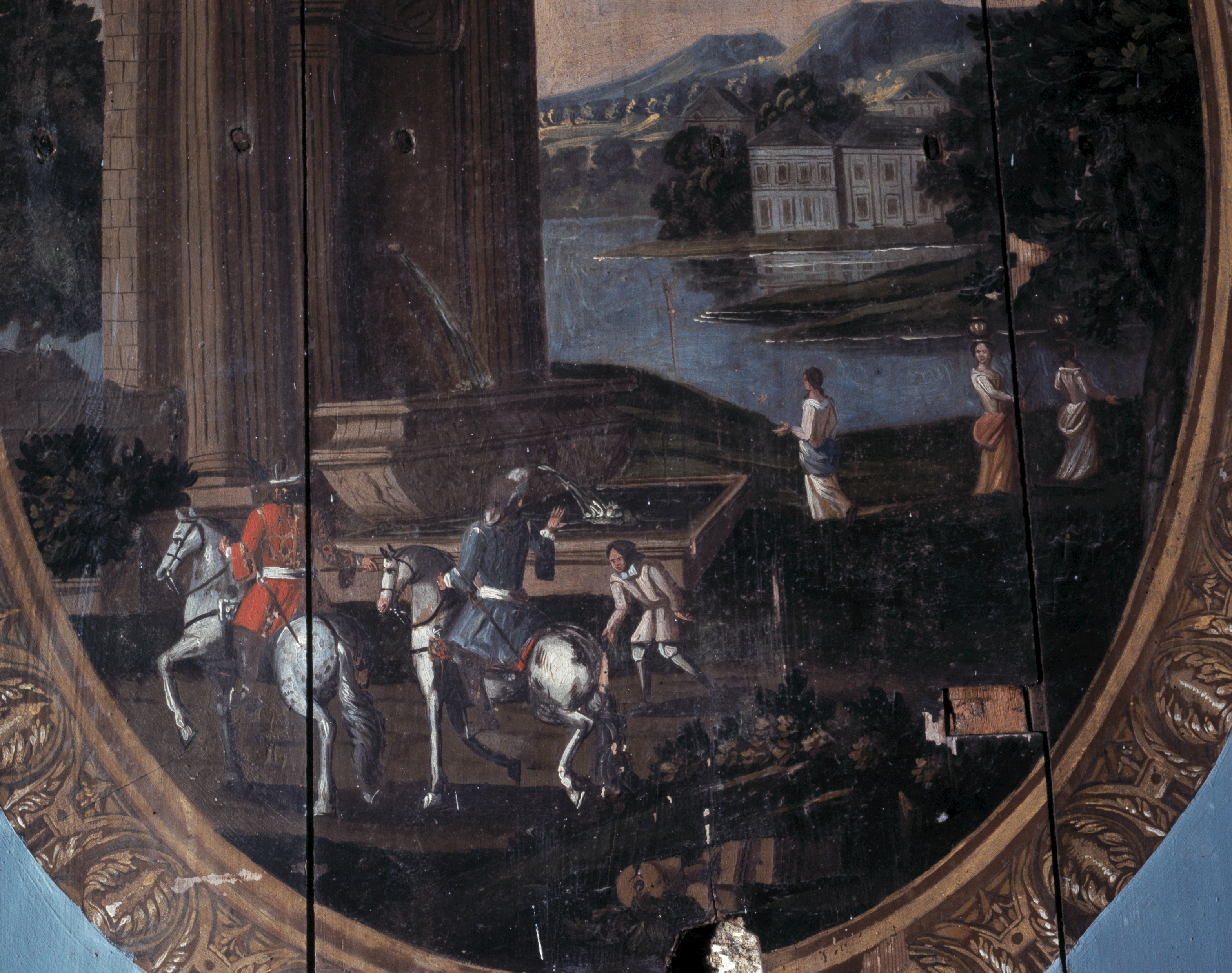 Dessus-de-porte, porte nord, Paysage avec une fontaine monumentale : les personnages (état en 1986)Immatriculation