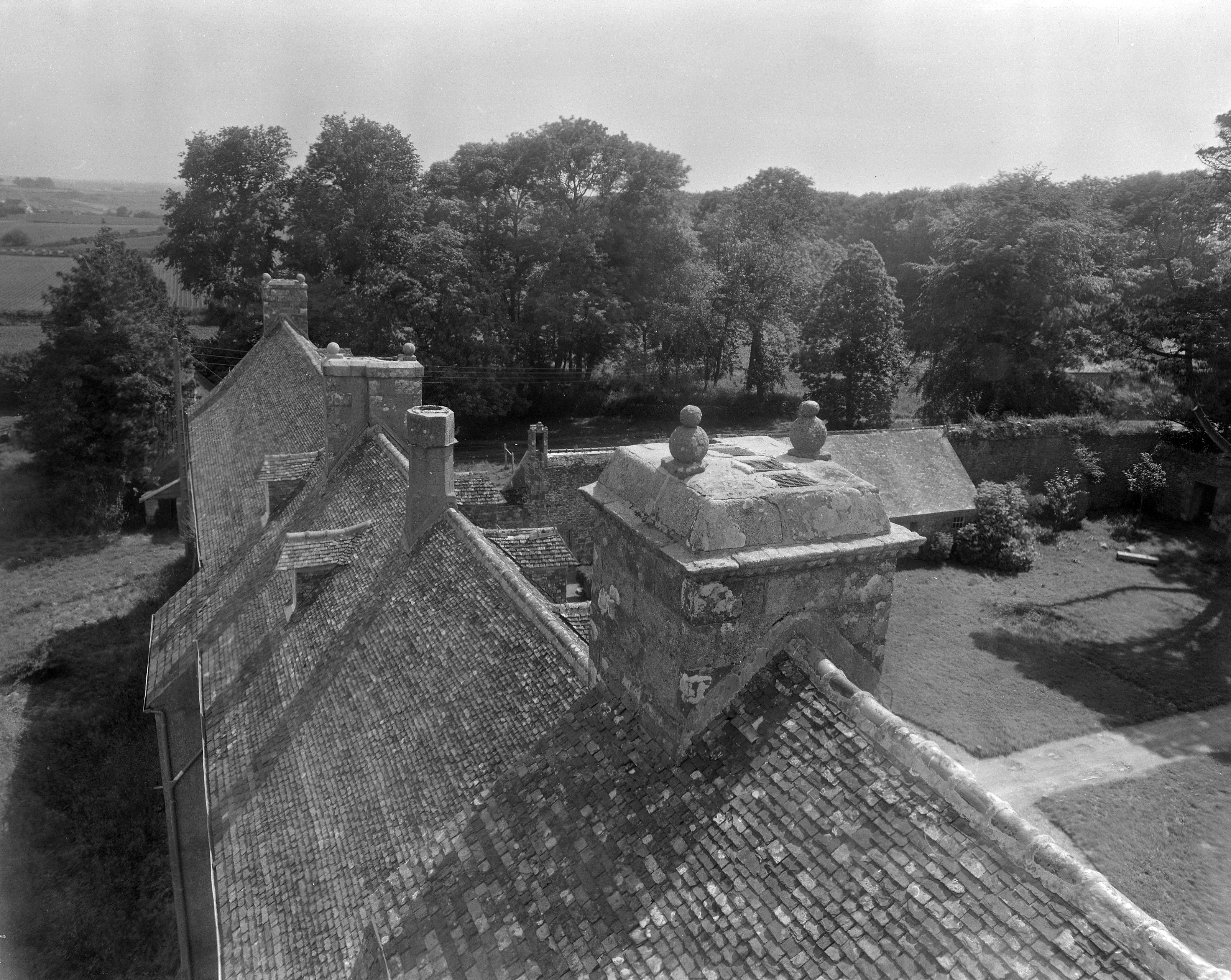 Château : chapiteaux du premier étage de la tour d'angle, vue des toits pris de la tour (état en 1986)Immatriculation