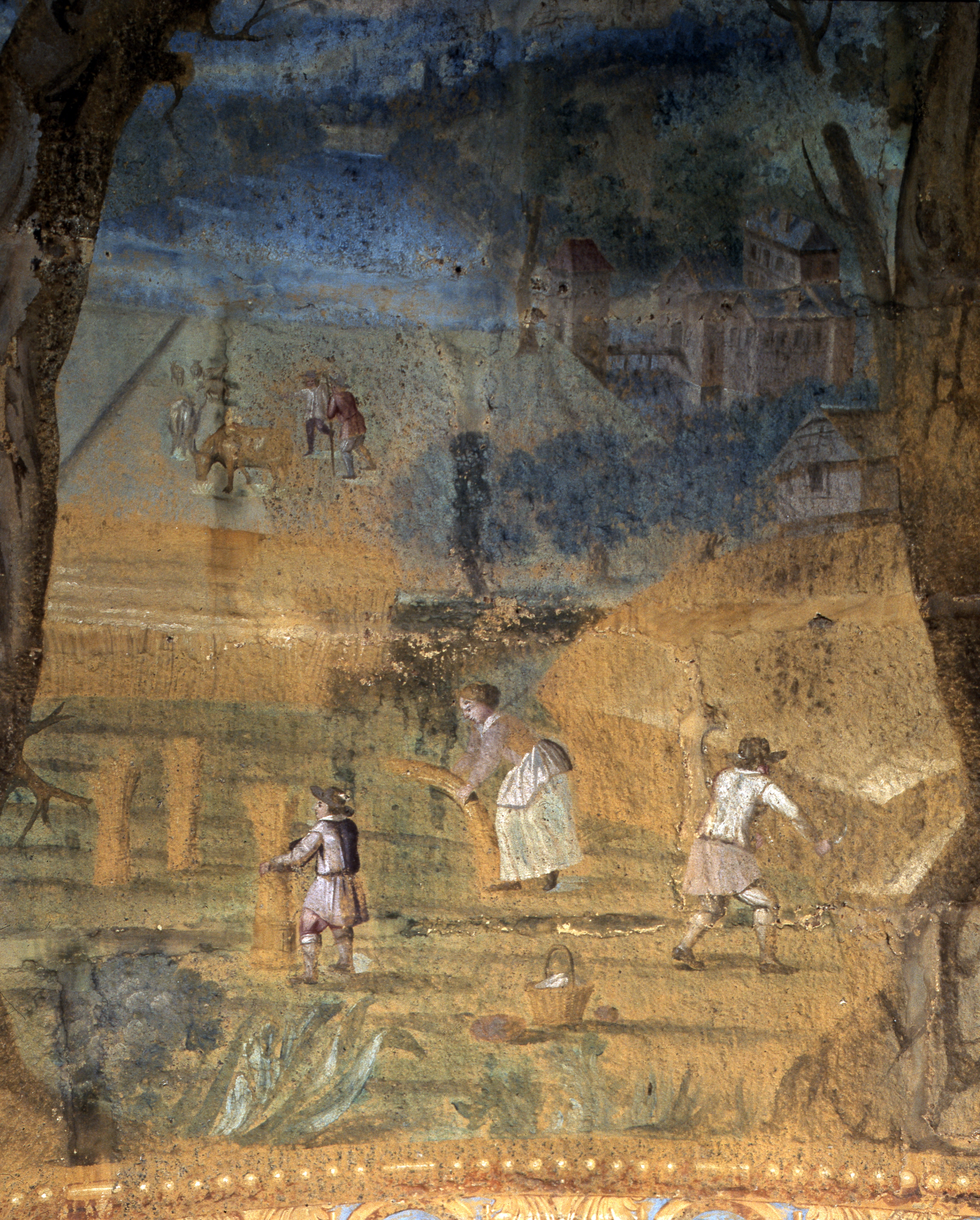 Peinture monumentale 1 (nord), Vie à la campagne : personnages de droite (état en 1986)Immatriculation