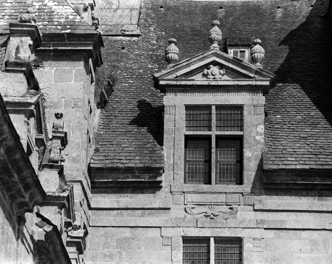 Aile de logis à gauche du corps de l'escalier, lucarne avec décor sous l'appui et pot à feuImmatriculation