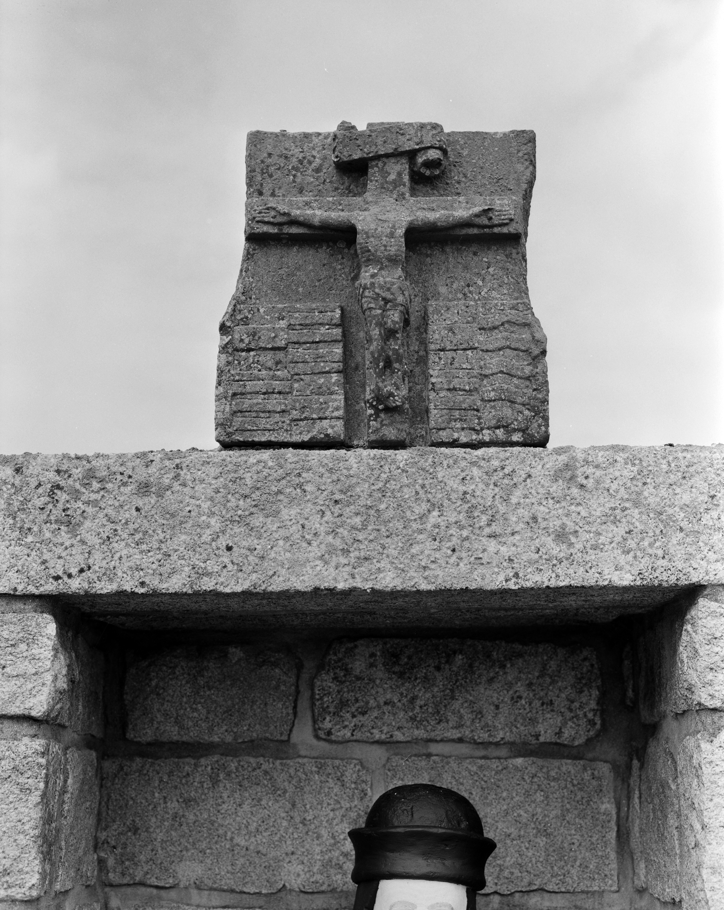 Fontaine de dévotion : remploi (?) d'une pierre de kersantite portant un Christ en croix encadré de blasons (état en 1986)Immatriculation