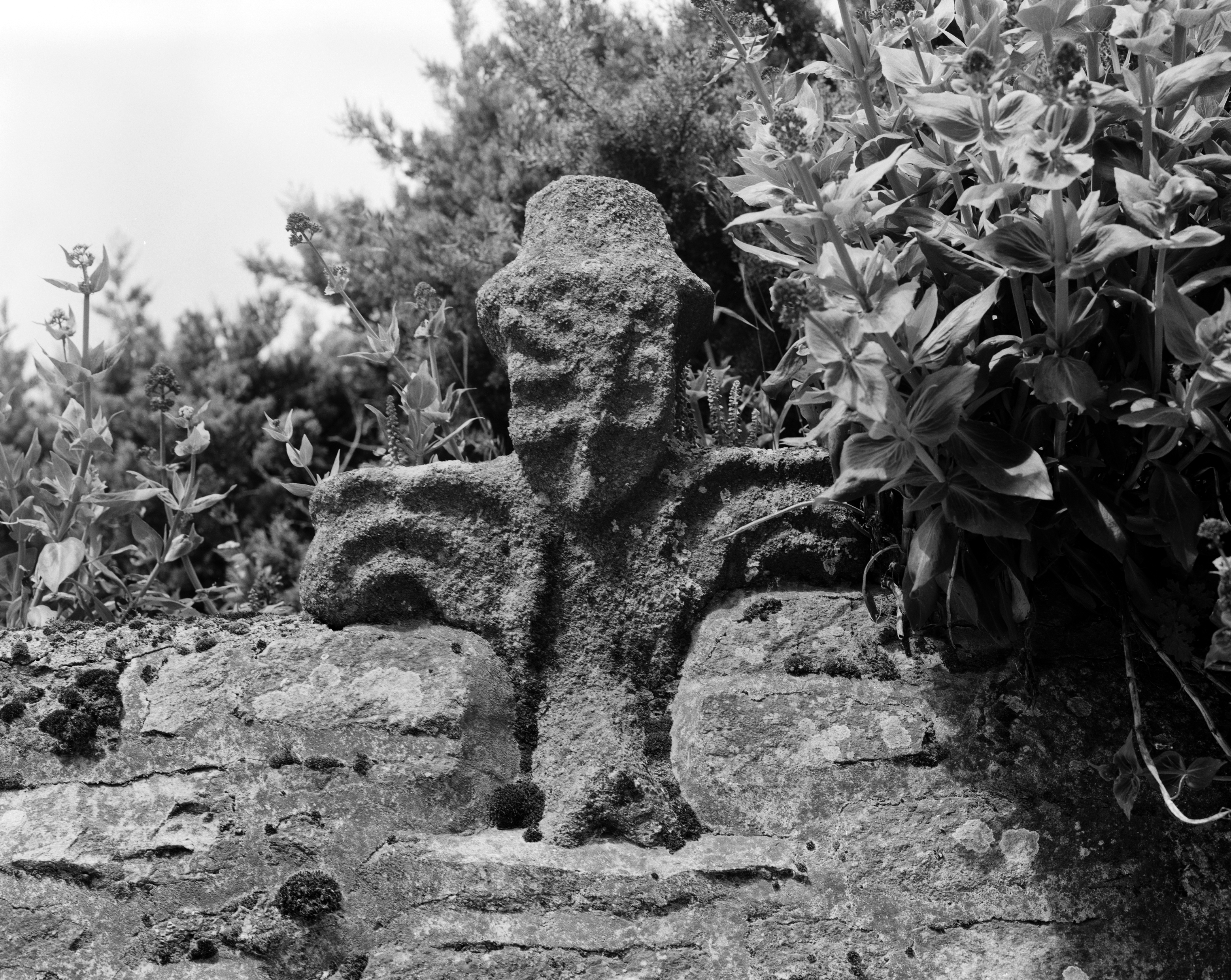 Dans l'enclos, pierre sculptée remontée : le lion peut être celui des armoiries de la famille de Carman (état en 1986)Immatriculation