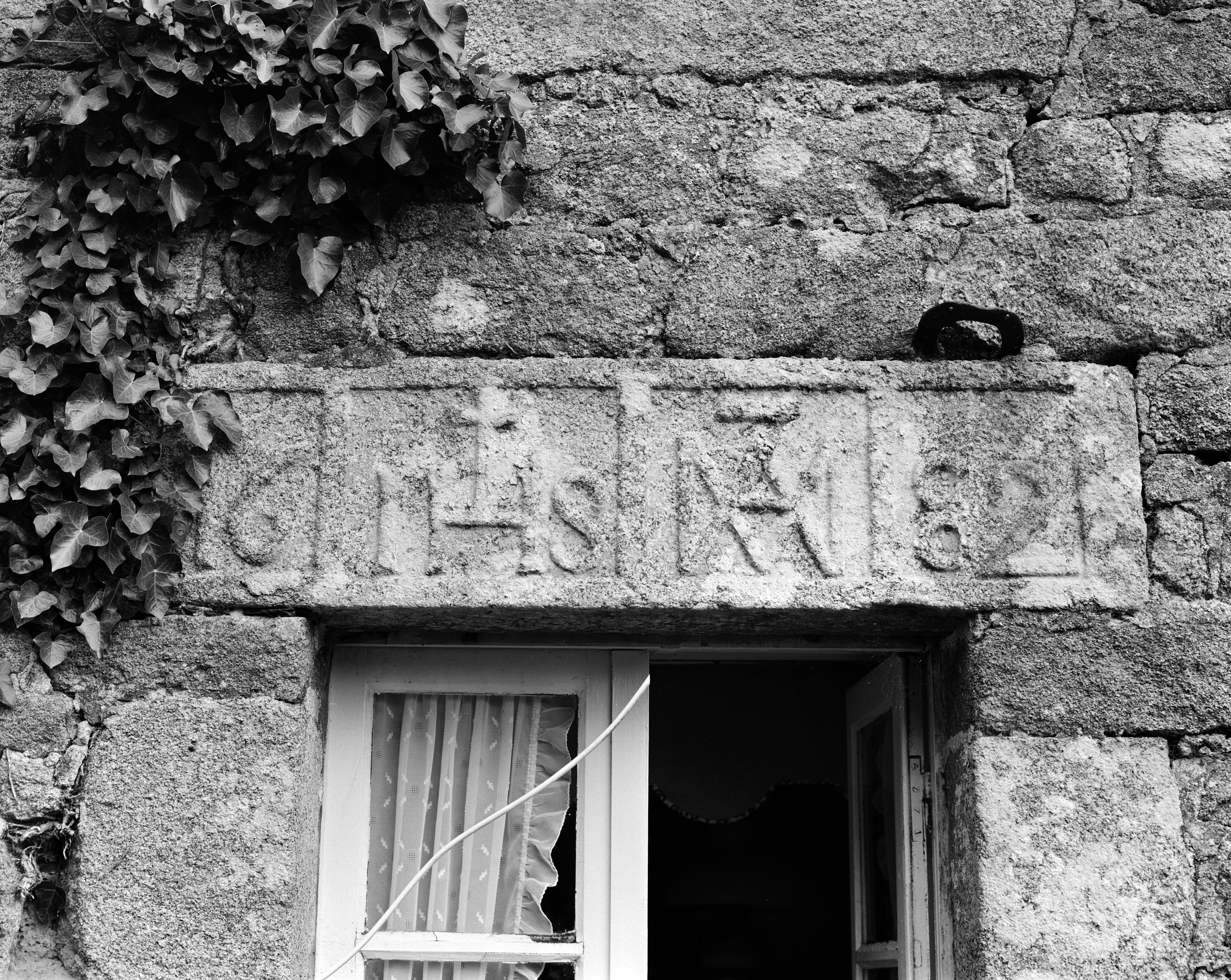 Ferme, élévation sud du logis : inscription sur le linteau de la fenêtre ouest du rez-de-chaussée (état en 1986)Immatriculation