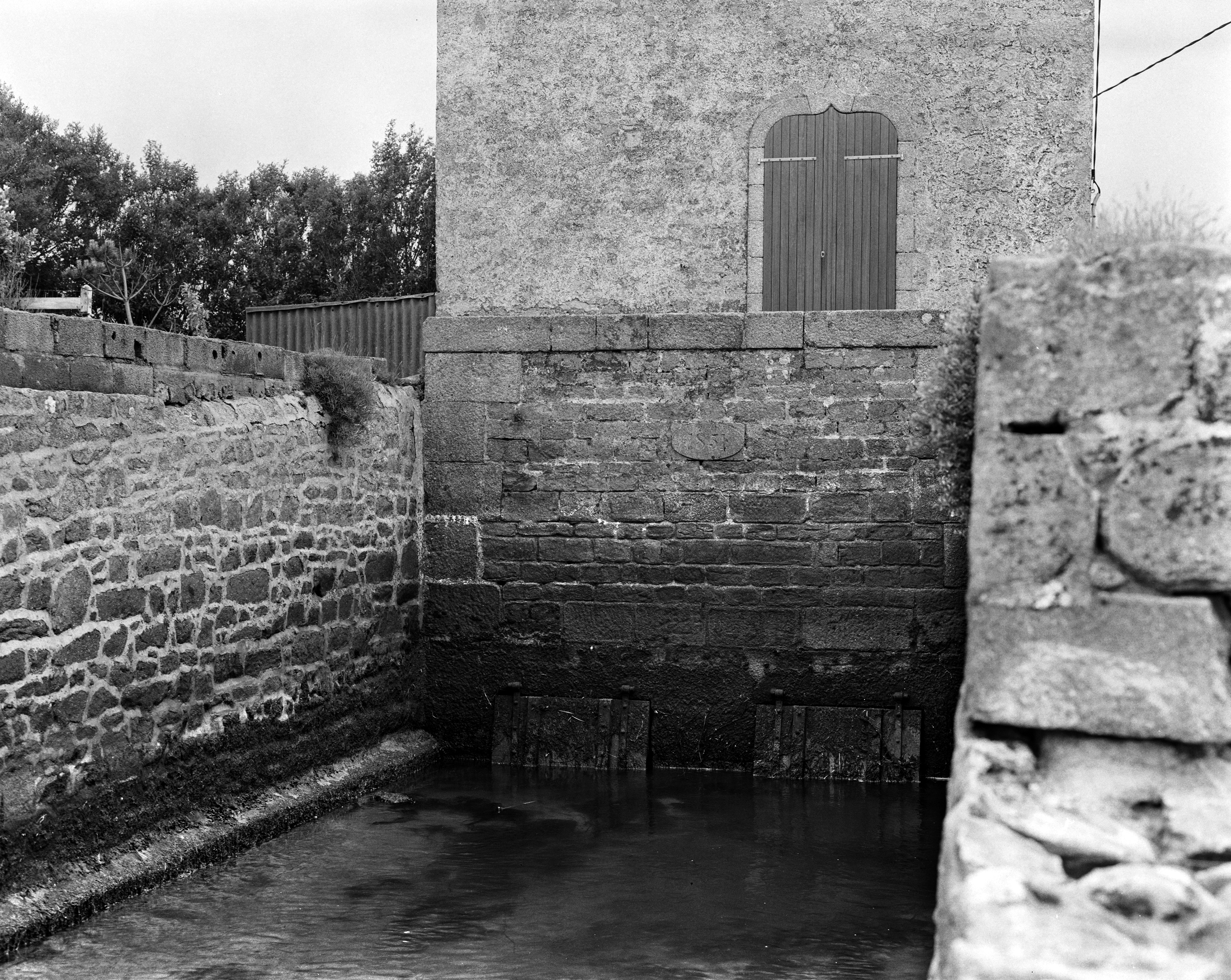 Barrage, élévation nord : vannes d'évacuation de l'eau et inscription 1851 (état en 1986)Immatriculation