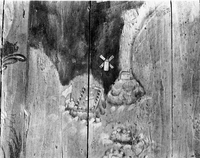 Représentation du Fort Bloscon et de la chapelle Sainte-Barbe au 18e siècle (détail d'une peinture sur bois réalisée dans une maison de marchand de Roscoff datée de 1603)Immatriculation