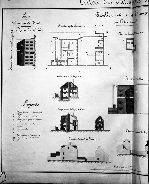 Atlas des bâtiments militaires des places de France : établissements de la presqu'île de Quélern : pavillon coté b et bâtiment coté M, 1836Immatriculation
