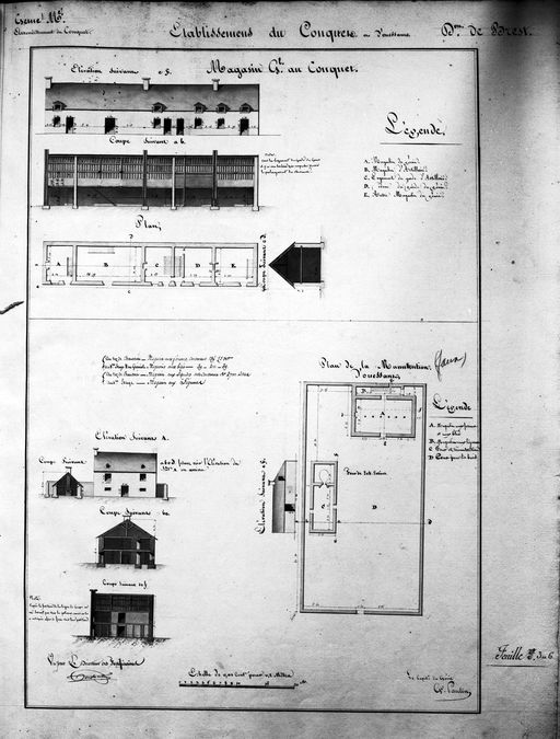 Atlas des bâtiments militaires des places de France : direction de Brest, arrondissement du Conquet : magasin général du Conquet et de la manutention des vivres d'Ouessant, vers 1836Immatriculation