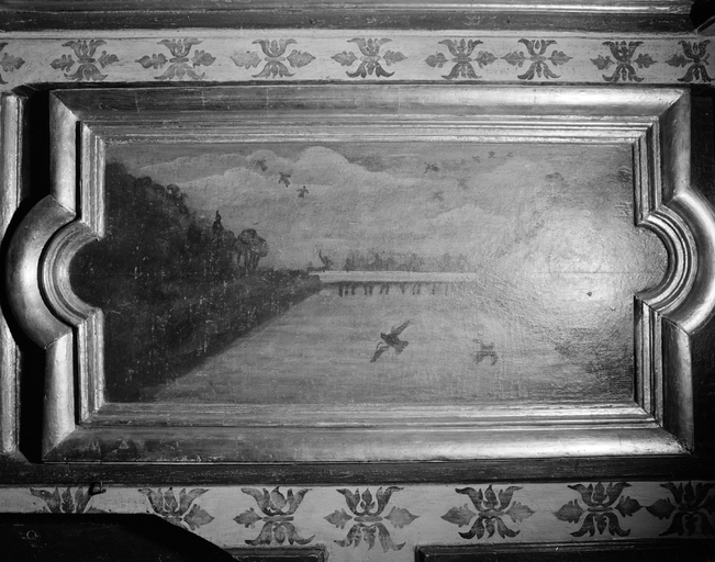 Orgue, vue des panneaux peints dans le soubassement à l'avant du buffet, photographie de 1987Immatriculation