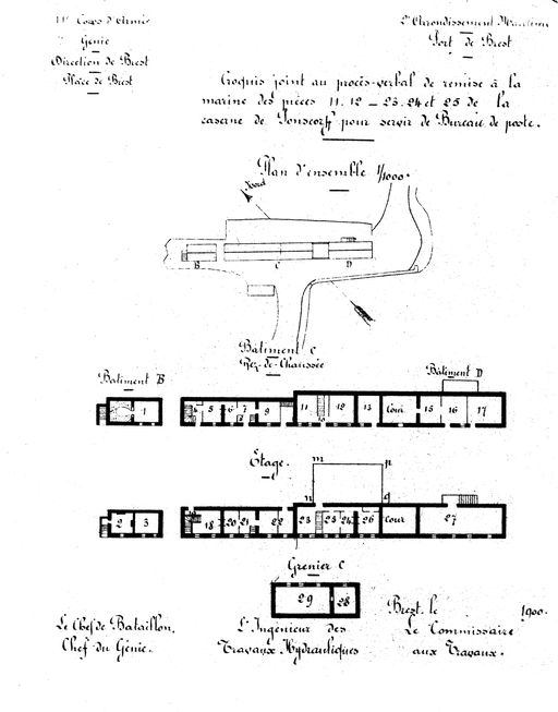 Plan d'ensemble des casernes de Pont Scorff. (Croquis joint au procés verbal de remise à la marine des pièces 11, 12 ; 23, 24 et 25 de la caserne pour servir de bureau de poste)Immatriculation