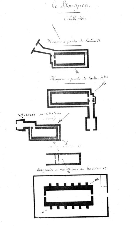 Plan du magasin à poudre du bastion 14. Plan du magasin à poudre du bastion 15 bis. Plan du magasin à poudre du bastion 15. Plan du magasin de l'avancée du château. Plan de l'abri du bastion 17.Immatriculation