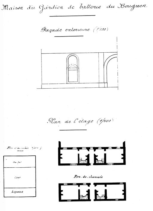 Plan de la maison du gardien de batterie du Bouguen. Elévation façade extérieure. Plan du rez-de-chaussée et de l'étage. Brest.Immatriculation