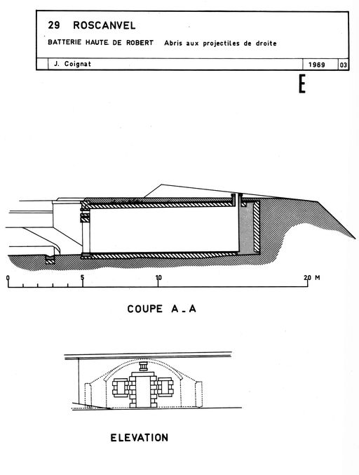 Batterie haute, coupe A-A et élévation de l'abri aux projectiles de droiteImmatriculation