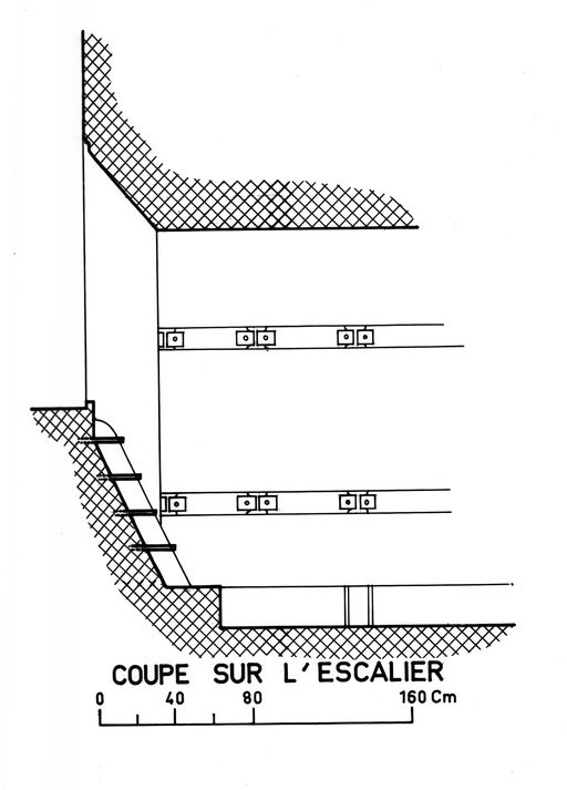 Coupe des escaliers et de l'entrée (aux soutes à munitions de la batterie de mortiers de la pointe des Capucins : ?)Immatriculation