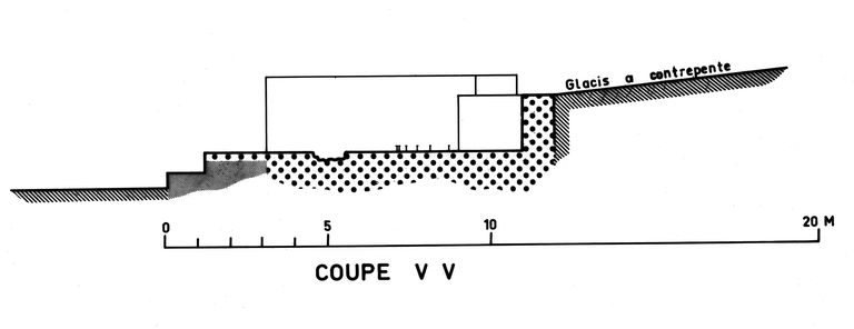 Coupe V-V d'une plate-forme de pièce de la batterie de mortiers de la pointe des CapucinsImmatriculation
