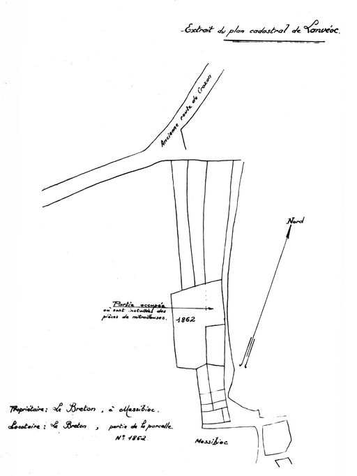 Plan cadastral de situation du lieu-dit Messibioc à Lanvéoc (parcelle n° 1862, propriétaire : Le Breton). Légende : partie occupée par la Marine où sont installées des pièces de mitrailleuses.Immatriculation