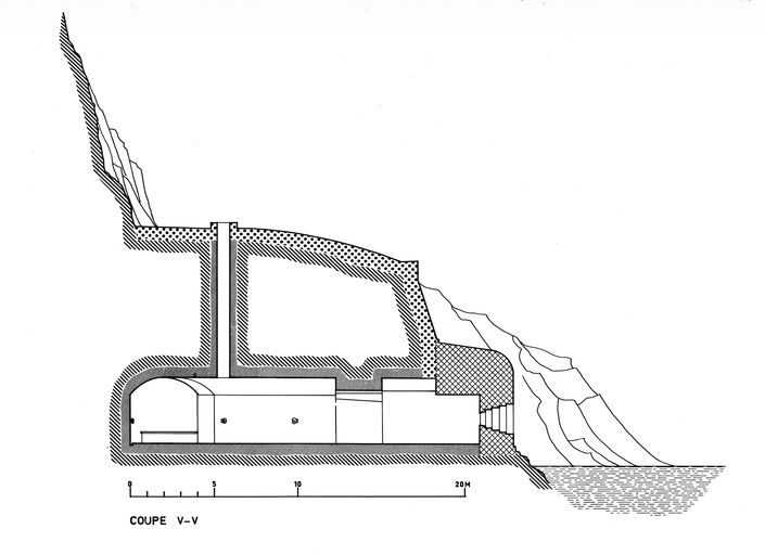 Batterie de rupture casematée (2 canons M de 32 cm modèle 1870-1884 sur affûts M modèle 1888) puis casemates (2 canons antichars de 5cm Kwk) (Cr 42), au ras de l'eau, Pointe des Espagnols (Roscanvel),