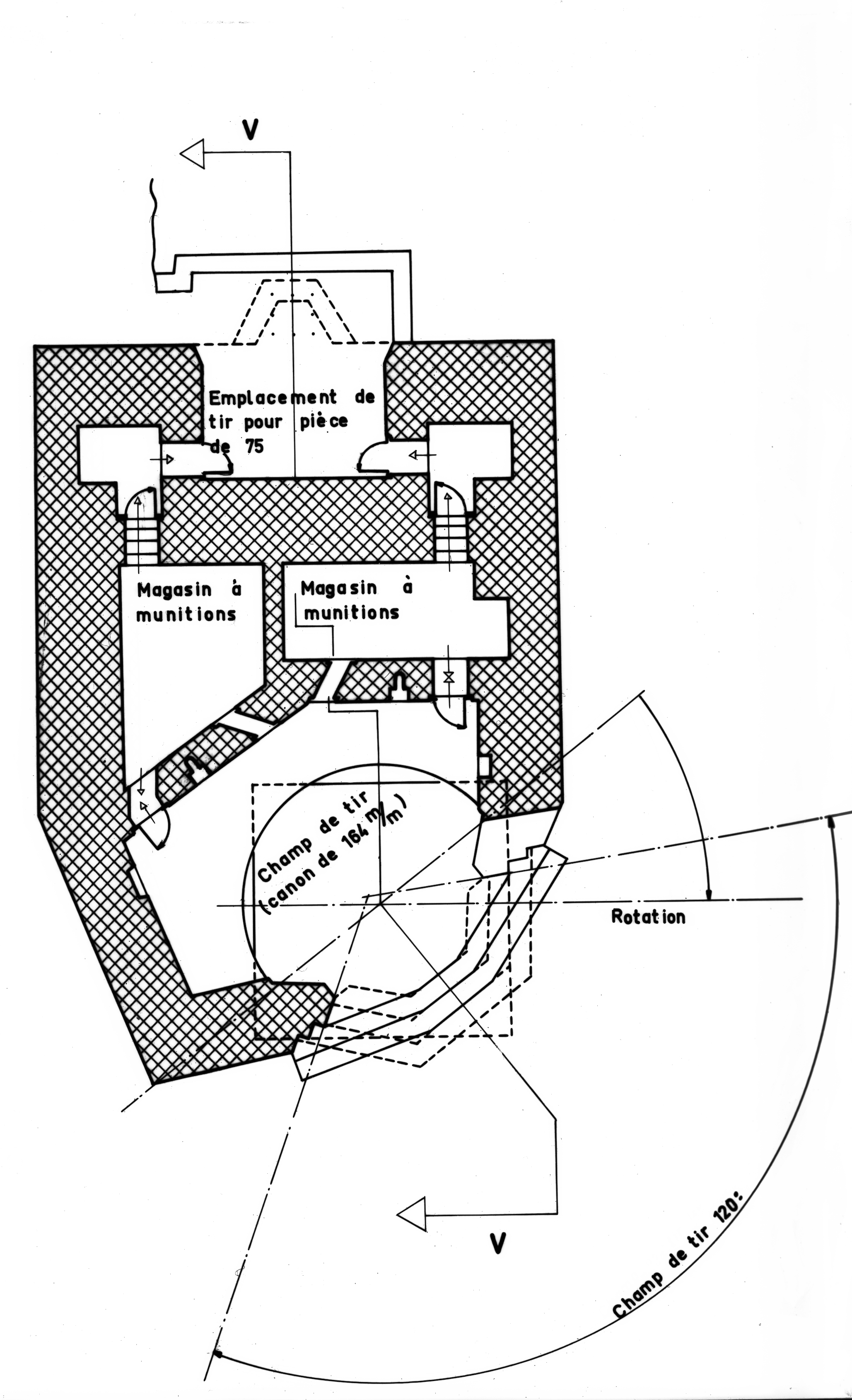 Plan de l'un des quatre bunkers - casemates pour canon de 164 mm flanquée à l'arrière d'une pièce de 75 mmImmatriculation