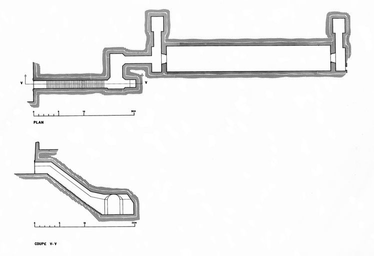 Plan et coupe V-V du magasin à munitions sous rocImmatriculation
