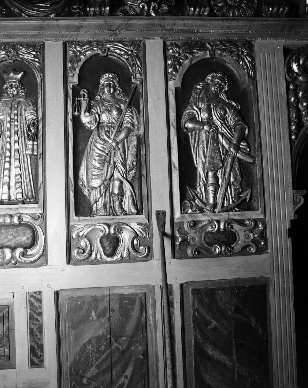 Soubassement du grand buffet, bas-reliefs sculptés et dorés, la Justice et l'Espérance.Immatriculation